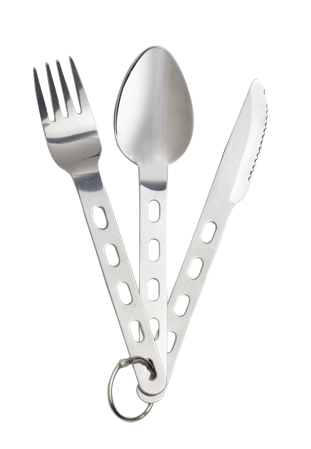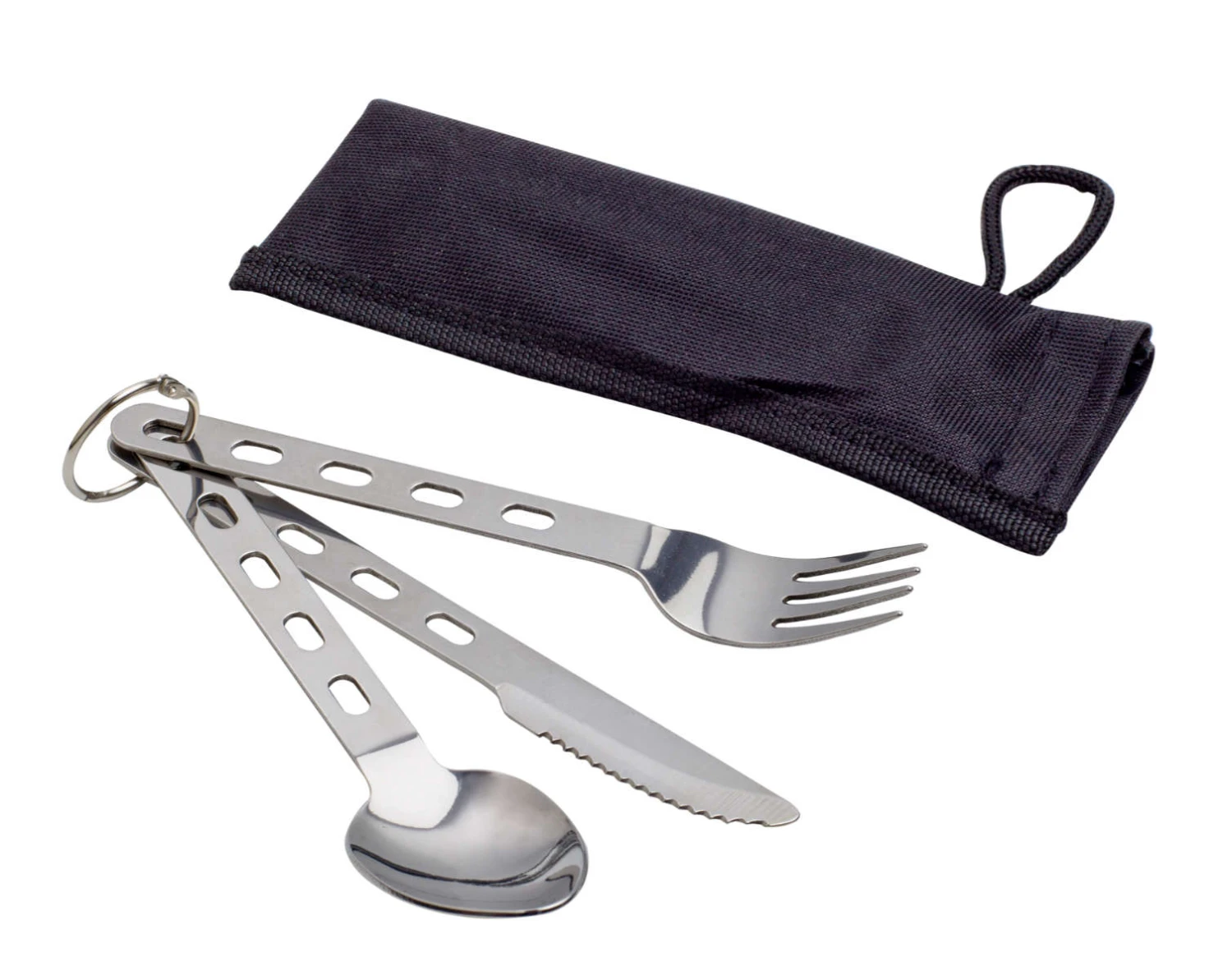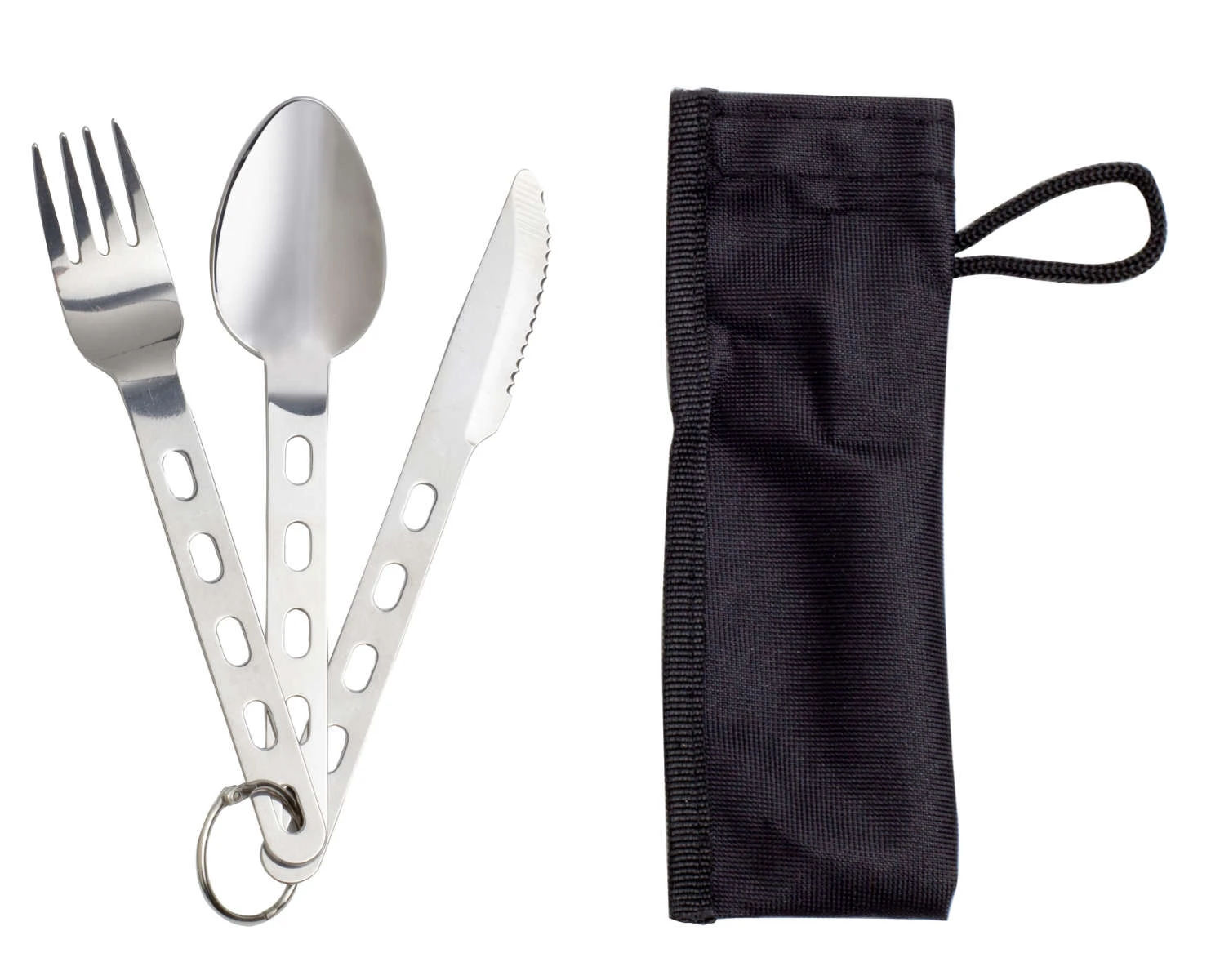 Das Edelstahl Essbesteck Light 3-teilig von A.Blöchl ist für diejenige perfekt, die bei Ihrer Tour auf jedes Gramm Gewicht achten wollen. Das Camping Besteck Light von Blöchl wiegt dabei nur 87g und ist somit kaum schwerer als ein Einwegbesteck. Durch Bohrungen in den Griffen wird das Material auf ein Minimum reduziert ohne dabei an Stabilität zu verlieren. Für den Transport werden Messer, Gabel und Löffel an einem zu öffnenden Verbindungssring befestigt. Dieser wiederrum kann Beispielsweise auch aussen am Rucksack befestigt werden, so dass das Besteck nach dem reinigen unterwegs gut trocknen kann. Das Besteck aus Edelstahl ist robust, umweltfreundlich und lebensmittelecht. Alle Teile sind leicht zu reinigen und spülmaschinentauglich. Das Besteckset wird inkl. praktischer Nylontasche geliefert.