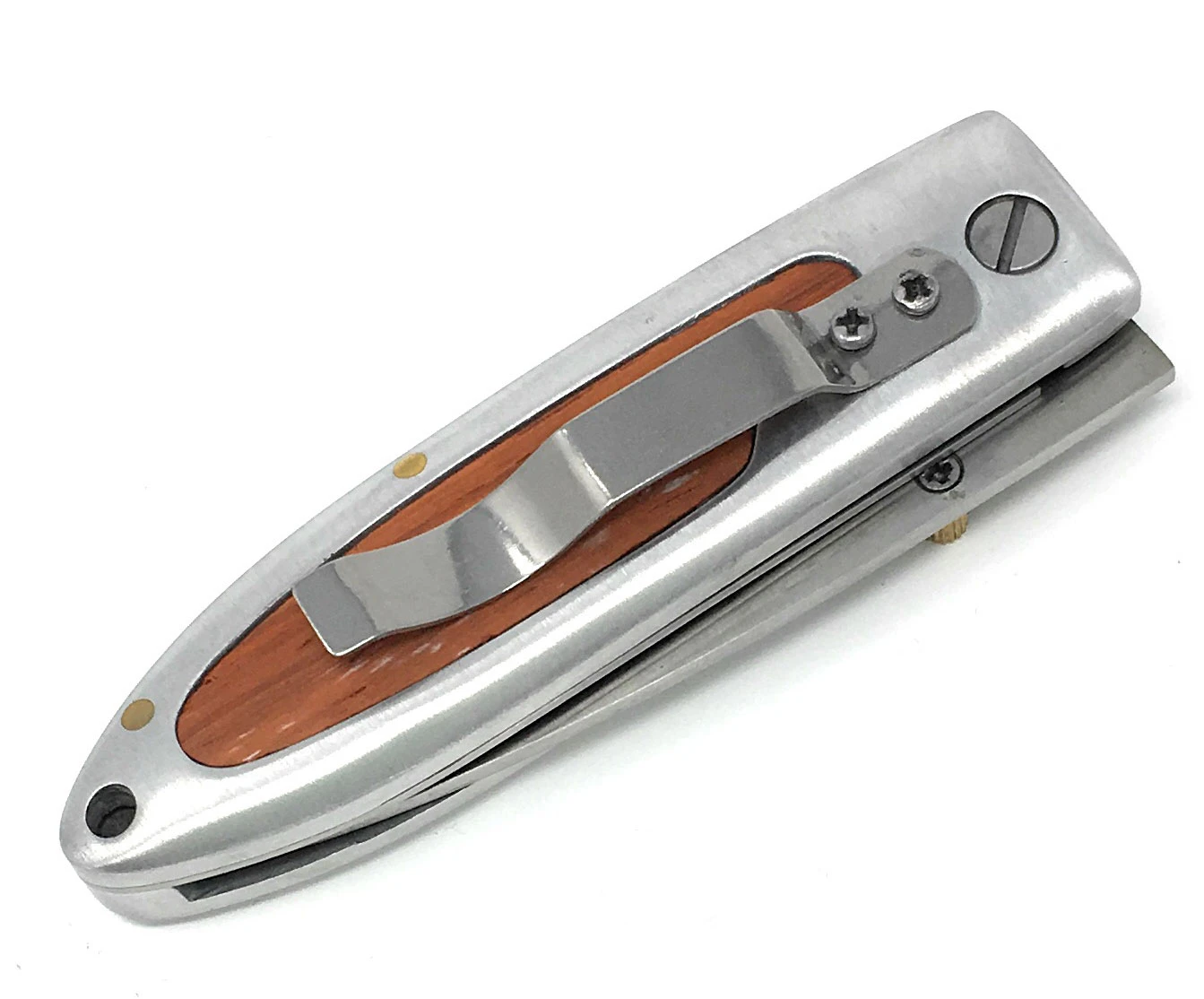 Das kleine aber feine Einhand Klappmesser von MFH mit schöner Holzeinlage im Metallgriff. Am Holzgriff befindet sich ausserdem ein kleiner Gürtelclip zum Anklipsen an die Hose oder Gürtel.