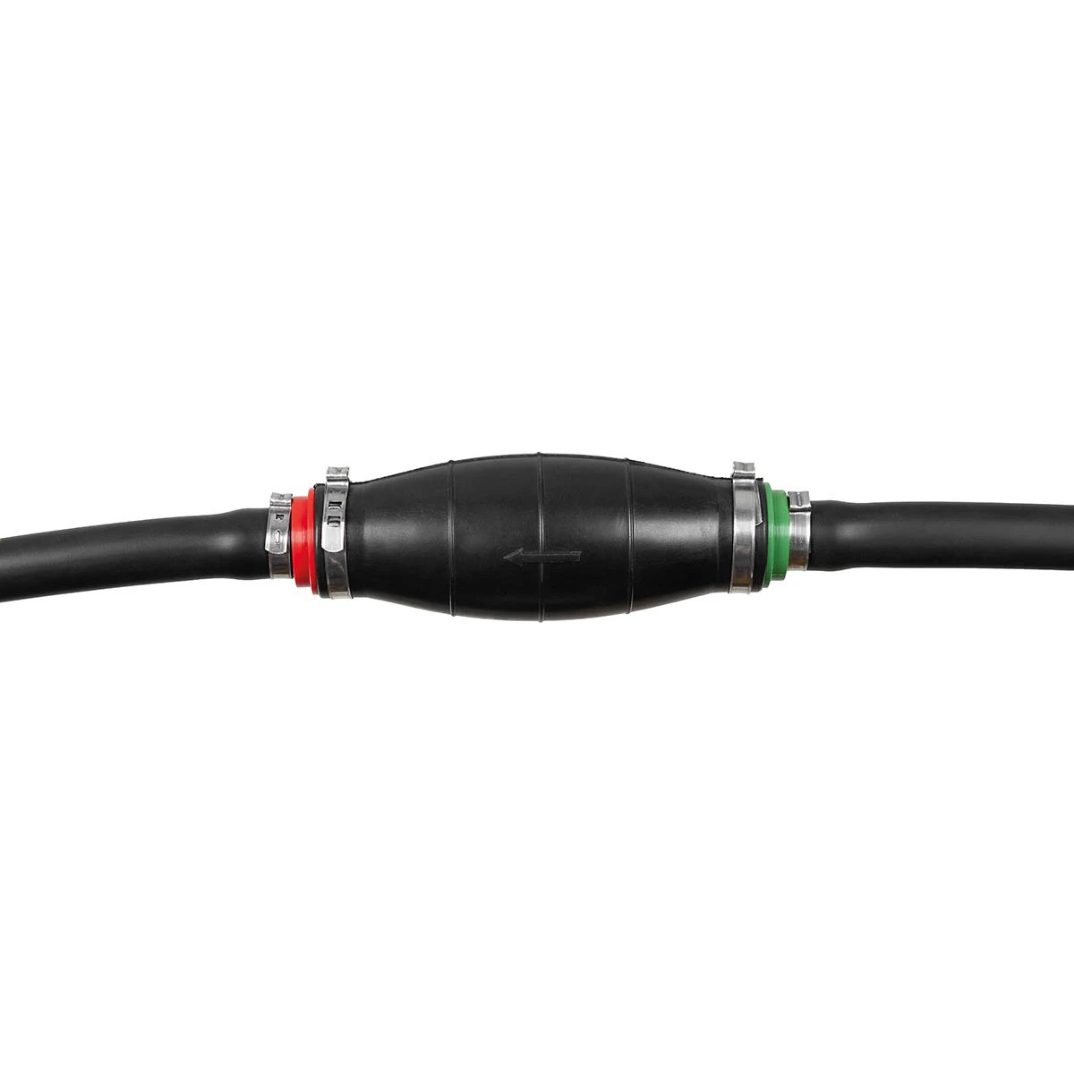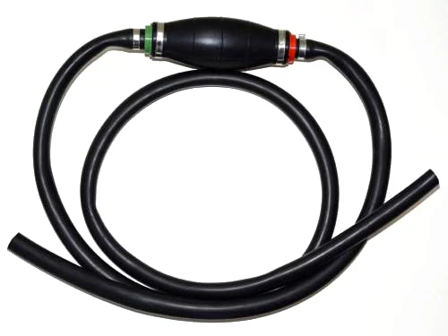 Die Ansaug- (grün) und Auslaufseite (rot) ist jeweils farbig markiert. Die Anwendung sehr einfach. Einen Schlauchteil in die Ansaugstelle (Tank), den anderen Teil in den Umfüllbehälter stecken und per Hand Pumpen. Wenn der Einfüllbehälter tiefer steht als der Abfüllbehälter, reichen wenige Birnendrücke aus, damit die Flüssigkeit von alleine zu fließen beginnt. Somit können bis zu 10L/Minute umgefüllt werden.
