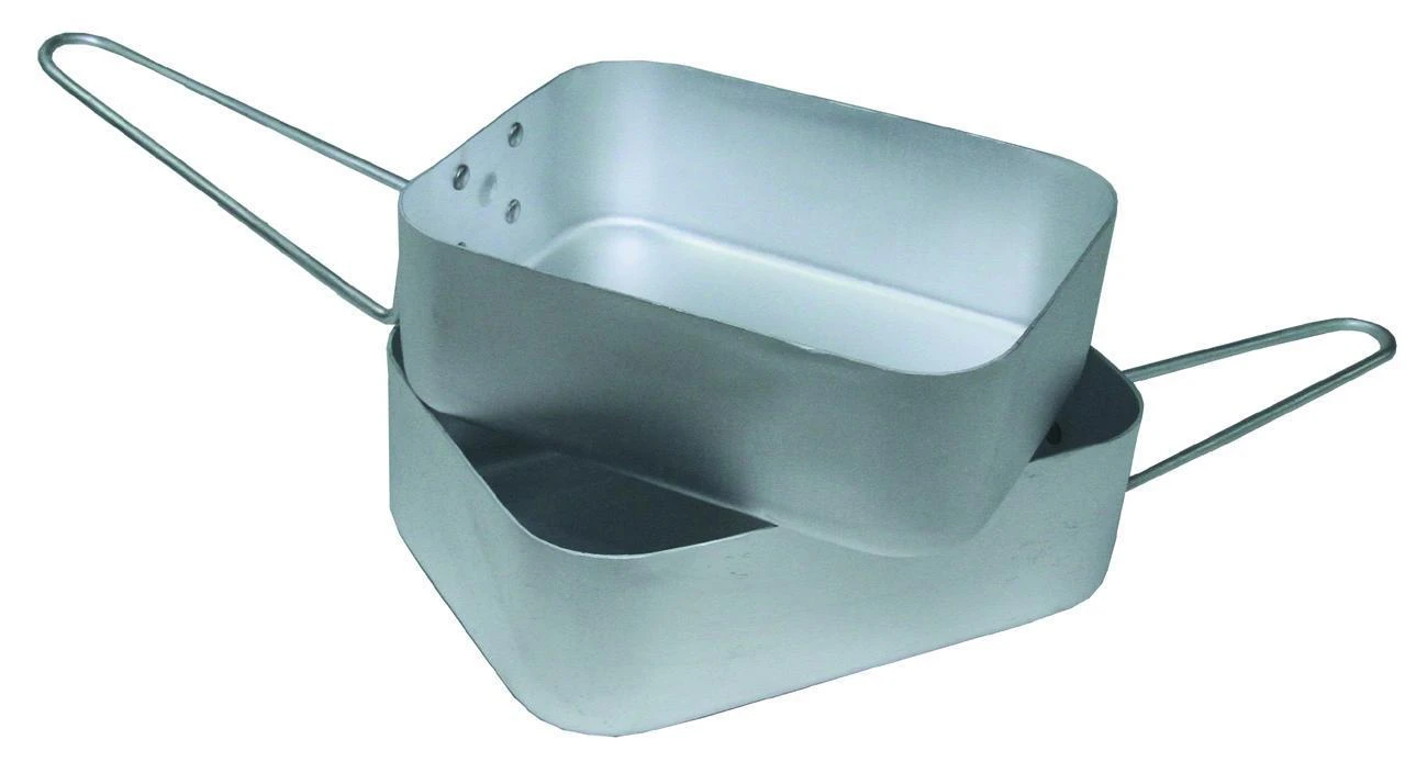 Zweiteiliges Aluminium Ess- und Kochgeschirr. Das hochwertige holländische Aluminium Geschirr besteht aus 2 Töpfen, die auch als Teller benutzt werden. Die Griffe der Töpfe sind einklappbar und können platzsparend ineinander gestapelt werden. Die Kanten wurden zur einfachen Reinigung abgerundet. Auf Börtelungen wurde komplett verzichtet, so dass sich kein Schmutz darin verfangen kann und die Töpfe sehr schnell und einfach gereinigt werden können.