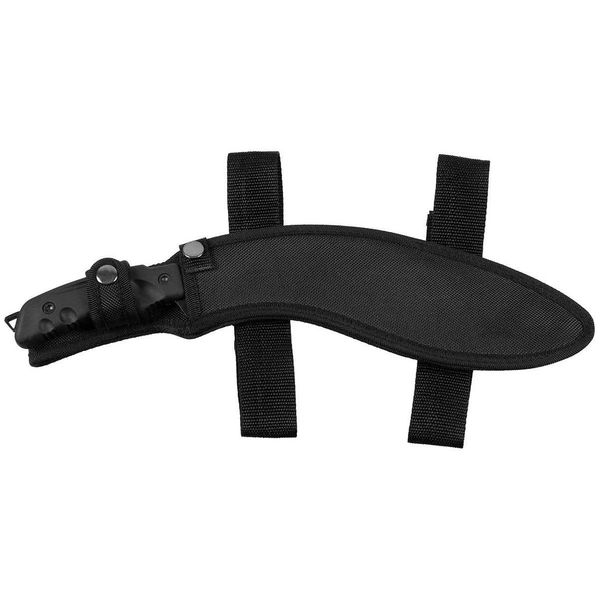 Die Garten- und Outdoor Machete von MFH hat eine durchgehende, stabile Klinge im traditionellen Kukri Design. Die leicht gebogene Form hilft beim Schlagen des Sumpfgrases oder Gehölzes. Der Griff aus stabilem ABS-Kunststoff liegt dank 3 Fingermulden sehr gut in der Hand. Ösen zum sichern sind vorne und hinten am Griff. Eine Nylonscheide mit Beinhalter und Sicherungsriemen verstaut die Machete sicher.
