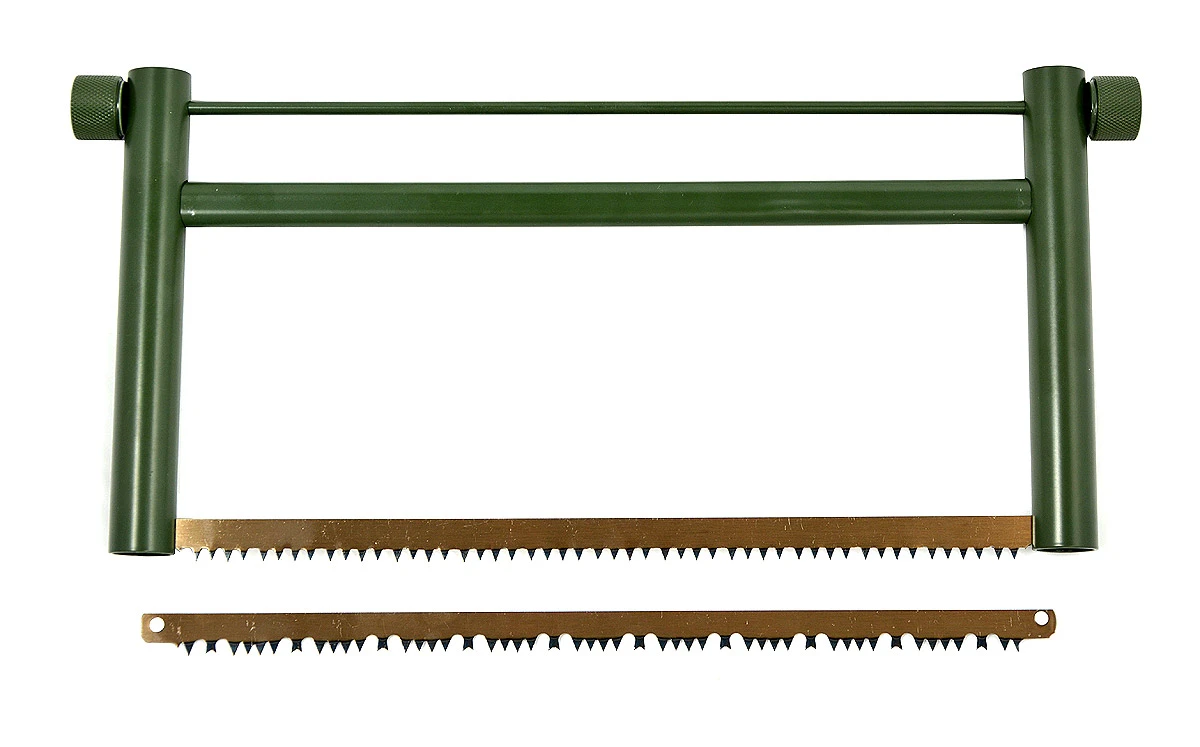 Die robuste Camping und Outdoor Alu Spannsäge von Blöchl ist auf ein kleines Packmaß zerlegbar und somit der ideale Begleiter beim Zelten, Campen, Angeln oder der nächsten Survival-Tour. Im Lieferumfang sind verschiedene 2 Sägeblätter, um für jede Holzart die passende Säge parat zu haben. Alle Einzelteile werden in den 2 Griffrohren sicher verstaut. Auch die Montage der Spannsäge geht einfach und schnell. Das scharfe Sägeblatt aus Manganstahl hat eine Länge von 32cm und ist somit auch zum durchsägen und zerkleinern dickerer Stämme und Hölzer geeignet. Ausser dem Sägeblatt sind die Bauteile aus Aluminium gefertigt, so dass die mobile Säge mit nur 320g auch sehr leicht ist.