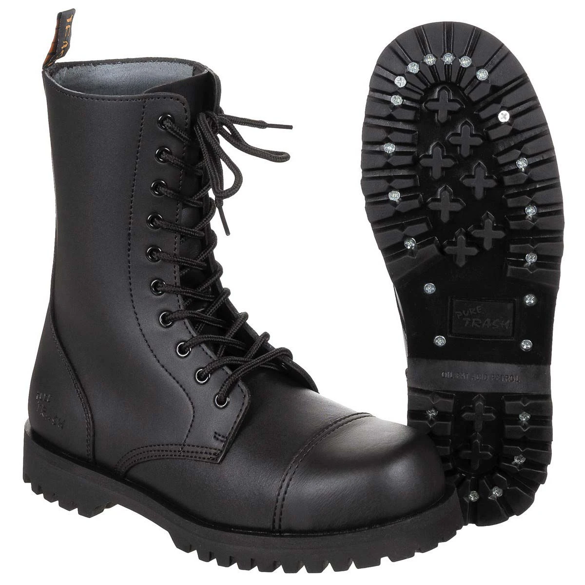 Der original Pure Trash-Springerstiefel mit 10-Loch Schnürung sind aus hochwertigem Rindsleder gefertigt. Die Stiefel sind mit Stahlkappe, sowie geschraubter und geklebter Sohle ausgestattet. Die Boots überzeugen durch hohe Qualität, Langlebigkeit und guten Laufeigenschaften. Der Klassiker unter den Lederboots passt zu jeder Gelegenheit – ob im Gelände, in der Stadt oder bei der Party.