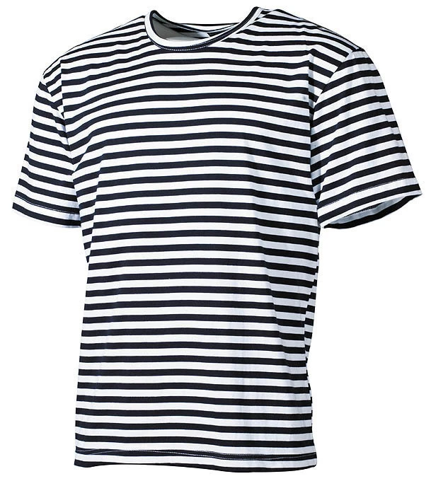 Russisches Marine Streifen T-Shirt aus 100% Baumwolle. Das Halbarmshirt ist marineblau (fast schwarz) mit weiß gestreift. Das Streifenshirt ist mit Rundhals-Ausschnitt und angenehm gerade geschnitten.