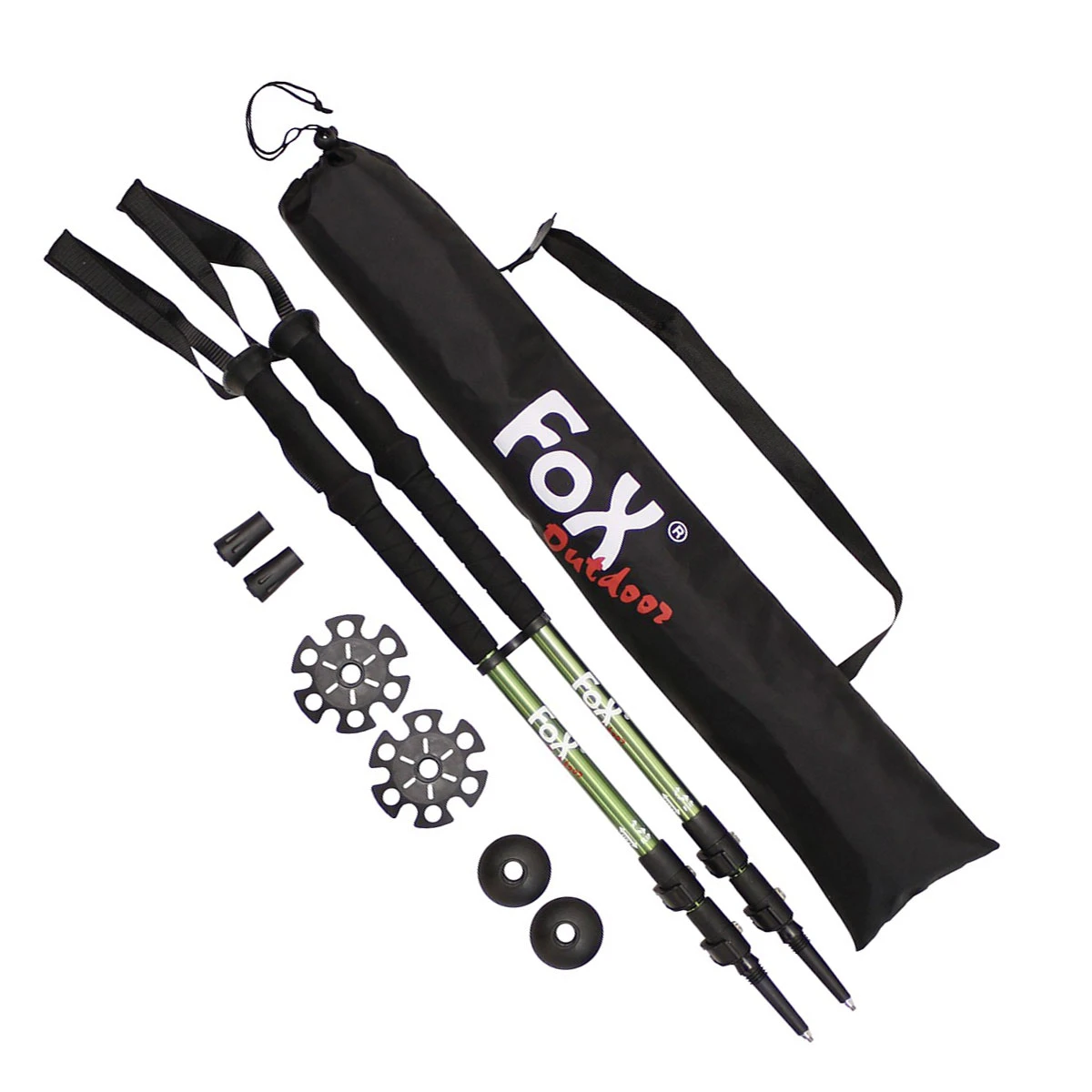 Zum bequemen Transport werden die Stöcke in der praktischen Fox Tragetasche geliefert. Sie können aber auch außen am Rucksack befestigt werden.