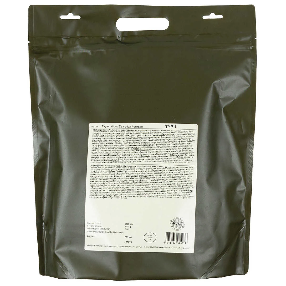 Mit der Trek´n Eat Tagesration Typ 1 sind Sie für einen Tag Nahrungstechnisch komplett versorgt. Mit Frühstück, zwei Hauptmahlzeiten und Getränke ist für eine Person und einen Tag alles dabei. Der grüne Tagesbeutel beinhaltet Ungarntopf, Pasta Primavera, Vollkornmüsli, Kaffee, Tee, Kekse, Fruchttrink und Snacks. Die Fertiggerichte sind komplett ohne Geschmacksverstärker und Konservierungsstoffe und sind dennoch 3 Jahre haltbar. Zur Zubereitung werden insgesamt rund 5,6 Liter Trinkwasser benötigt. Zur Zubereitung gießen Sie einfach kochendes Wasser bis zur Markierungslinie auf der zugehörigen Tüte und rühren diese sorgfältig um. Anschliessend den Beutel verschliessen und ca. 8-10 Minuten ziehen lasse, fertig. Das Müsli kann auch mit kaltem Wasser zubereitet werden.