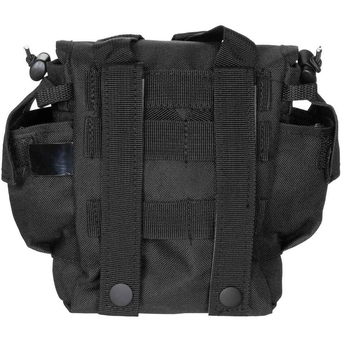 Die Tasche aus wasserabweisendem Polyester dienst zum einfachen Transport von Feldflaschen, Trinkflaschen, Geschirr oder ähnliche Gegenstände dieser Grösse. Die Tasche in der Grösse von 21x18x10cm hat ausserdem 2 kleine Seitentaschen mit Platz für Reinigungstabletten oder ähnlichem. Anzubringen mit elastischen Halteschlaufen an die Aufnahmeschlaufen der Molle Träger wie Westen, Rucksäcke usw.