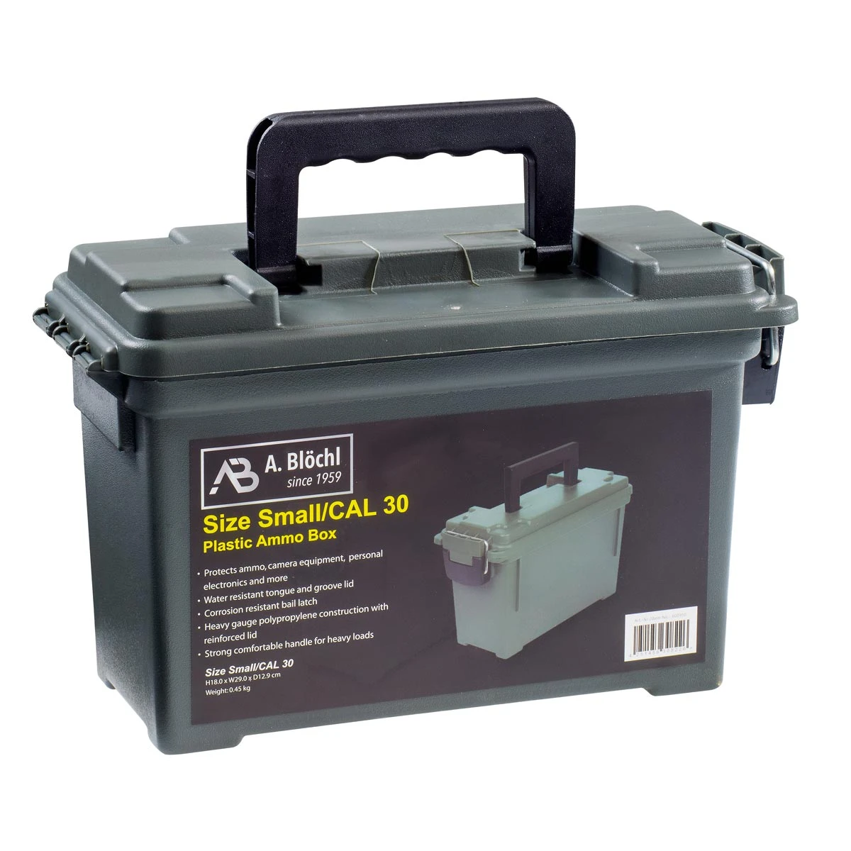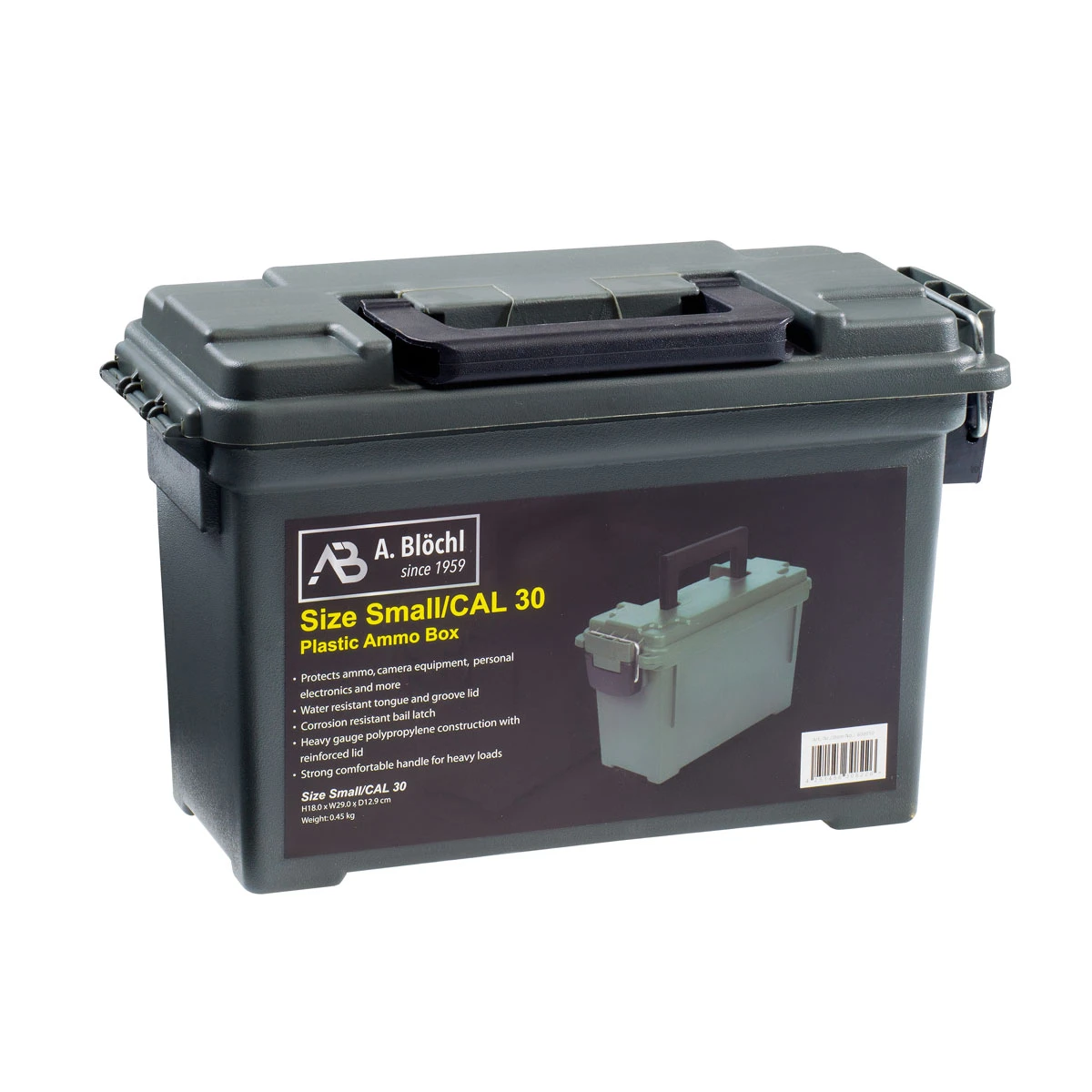 Die US Munitionskiste Small CAL 30 in der Grösse 29x18x13 cm ist eine praktische Aufbewahrungs- und Transportbox aus schlagfestem Kunststoff. Der Schnappverschluss schließt die Box effektiv und wasserdicht ab. Ein ergnonomisch geformter Tragegriff sorgt für angenehmen Transport auch bei schweren Lasten. Die Kiste in der Größe CAL 30 wird sehr gerne von Air Soft Spielern verwendet. Aber auch als Werkzeugbox oder sonstige Aufbewahrungsbox ist die Kiste hervorragend geeignet. Die stabelbare Box ist durch bereits eingearbeitete Ösen durch ein Vorhängeschloss (nicht im Lieferumfang) abschließbar.
